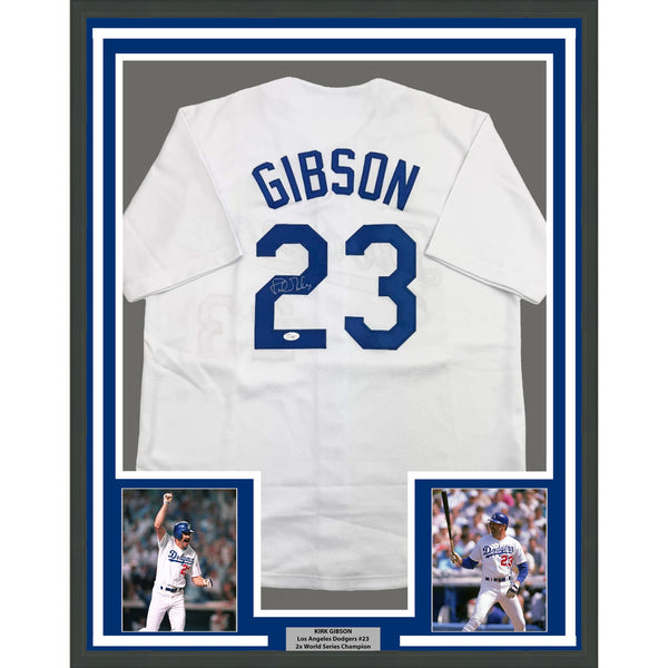 Framed Autographed/Signed Kirk Gibson 35x39 Los Angeles LA White Jersey JSA COA The item is professionally framed and matted with two 5x7 photos, measures 35x39 inches and is ready to be hung in your man cave! Photo and matting requests can be made.
