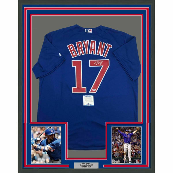 FRAMED Autographed/Signed KRIS BRYANT 33x42 Chicago Blue Jersey Beckett BAS COA The item is professionally framed & matted with two 8x10 photos, measures 33"x42" and is ready to be hung in your man cave! NOTE: COA card will be mounted on the back of the frame, not inside it on top of the jersey as seen in the picture. Please allow up to 5 business days for the item to be framed, packaged safely, and picked up by USPS. Photo and matting requests can be made.