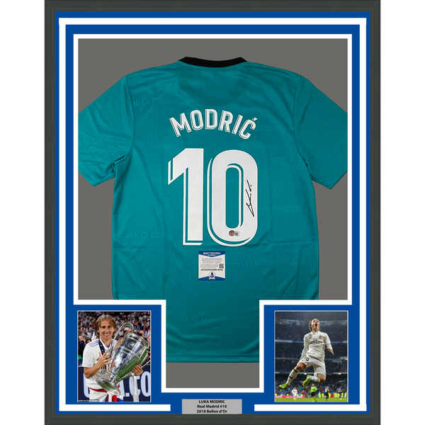 Framed Autographed/Signed Luka Modric 33x42 Real Madrid Teal Jersey BAS COA The item is professionally framed & matted with two 5x7 photos, measures 33"x42" and is ready to be hung in your man cave! NOTE: COA card will be mounted on the back of the frame, not inside it on top of the jersey as seen in the picture.