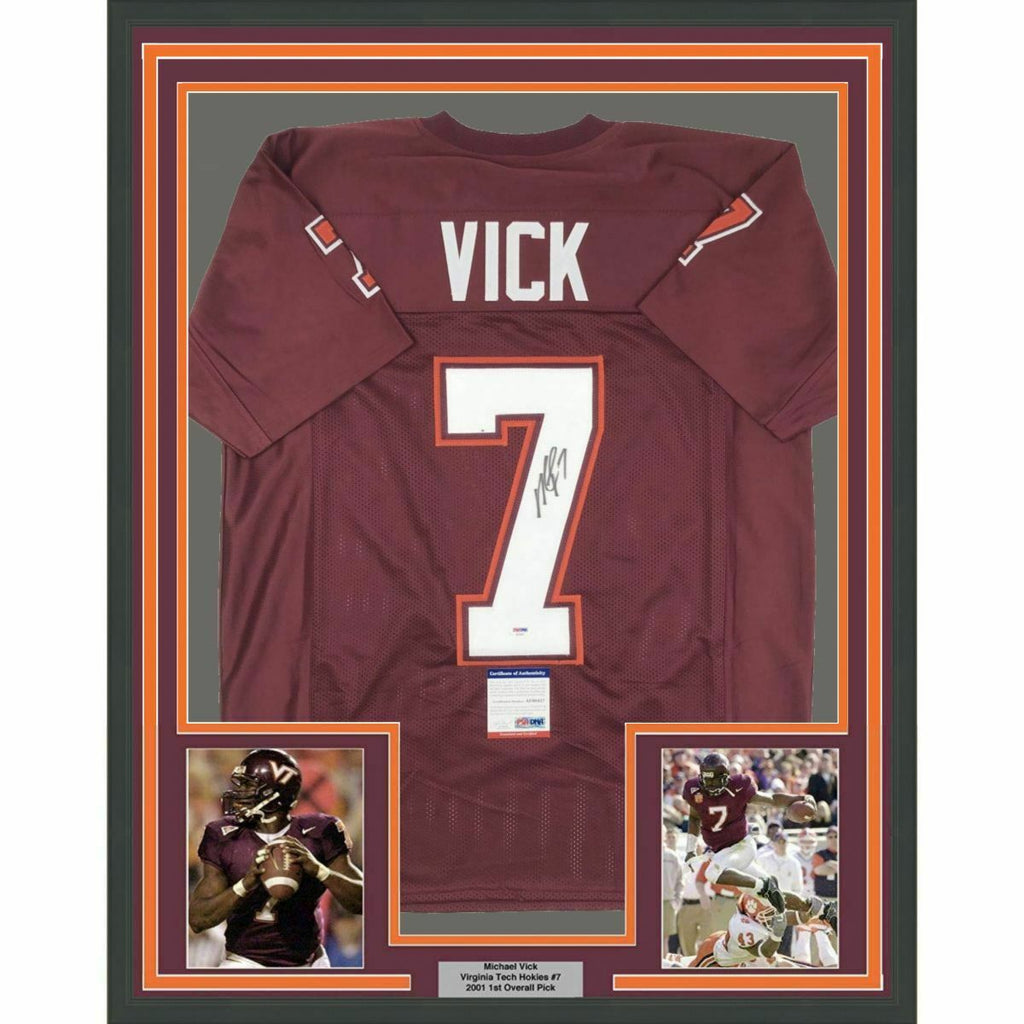FRAMED Autographed/Signed MICHAEL MIKE VICK 33x42 Virginia Tech Jersey PSA COA The item is professionally framed & matted with two 8x10 photos, measures 33"x42" and is ready to be hung in your man cave! NOTE: COA card will be mounted on the back of the frame, not inside it on top of the jersey as seen in the picture.