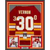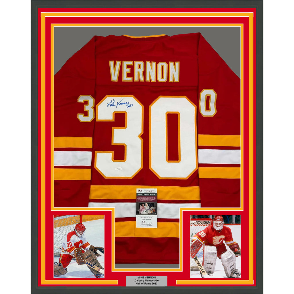 Framed Autographed/Signed Mike Vernon 35x39 Calgary Red Hockey Jersey JSA COA The item is professionally framed and matted with two 5x7 photos, measures 35x39 inches and is ready to be hung in your man cave! Photo and matting requests can be made.