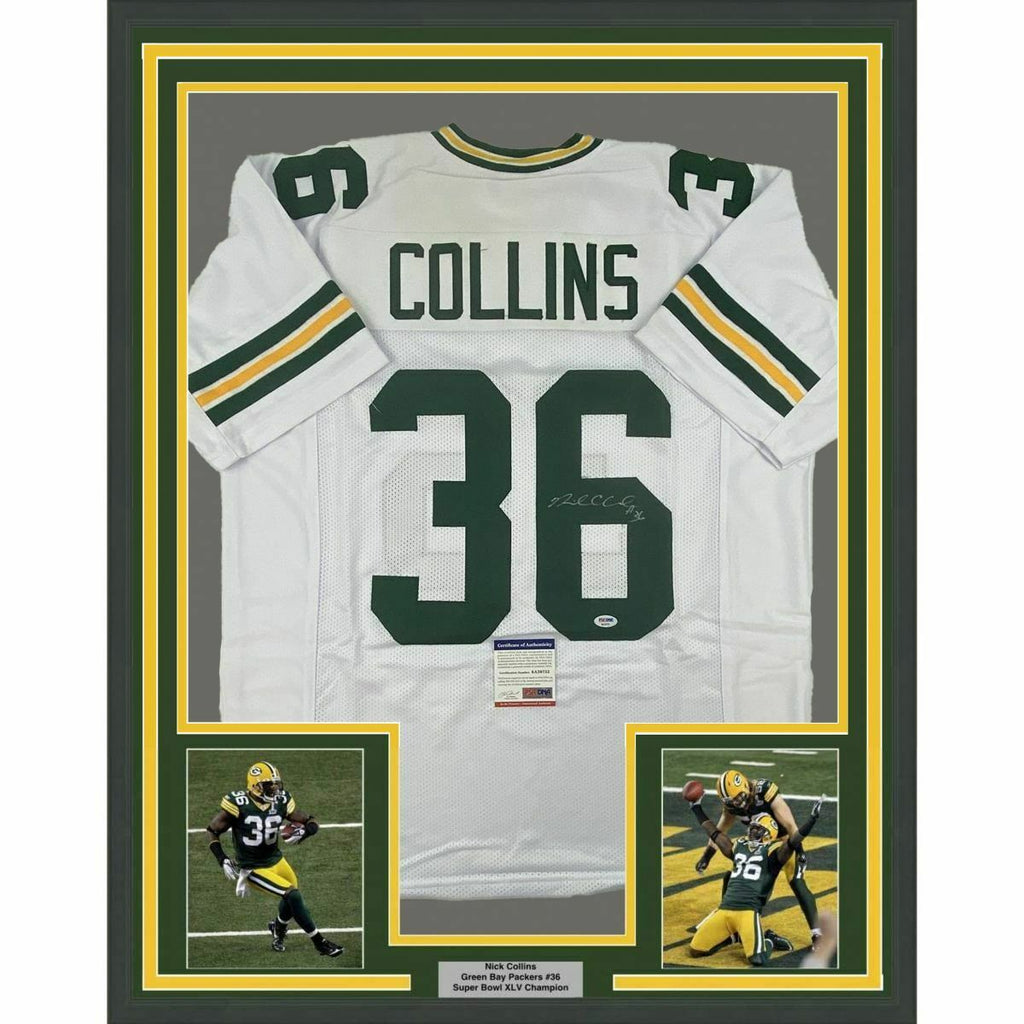 FRAMED Autographed/Signed NICK COLLINS 33x42 Green Bay White Jersey PSA/DNA COA The item is professionally framed & matted with two 8x10 photos, measures 33"x42" and is ready to be hung in your man cave! NOTE: COA card will be mounted on the back of the frame, not inside it on top of the jersey as seen in the picture.