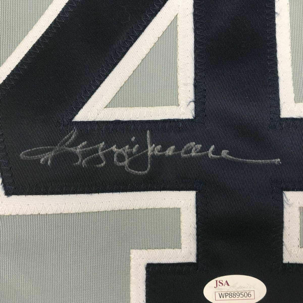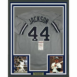 FRAMED Autographed/Signed REGGIE JACKSON 33x42 New York Grey Jersey JSA COA Auto The item is professionally framed & matted with two 8x10 photos, measures 33"x42" and is ready to be hung in your man cave! NOTE: COA card will be mounted on the back of the frame, not inside it on top of the jersey as seen in the picture.