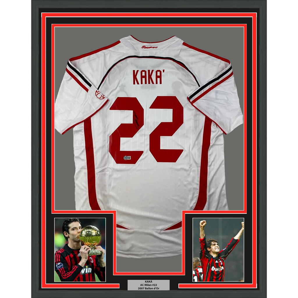 Framed Autographed/Signed Ricardo Kaka AC Milan 33x42 White Jersey BAS COA The item is professionally framed and matted with two 5x7 photos, measures 35x39 inches and is ready to be hung in your man cave! Photo and matting requests can be made.