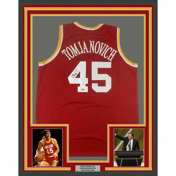 FRAMED Autographed/Signed RUDY TOMJANOVICH 33x42 Houston Red Jersey Tristar COA The item is professionally framed & matted with two 8x10 photos, measures 33"x42" and is ready to be hung in your man cave! NOTE: COA card will be mounted on the back of the frame, not inside it on top of the jersey as seen in the picture. Please allow up to 5 business days for the item to be framed, packaged safely, and picked up by UPS. Photo and matting requests can be made.