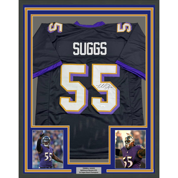 Framed Autographed/Signed Terrell Suggs 35x39 Baltimore Black Jersey JSA COA #2 The item is professionally framed and matted with two 5x7 photos, measures 35x39 inches and is ready to be hung in your man cave! Photo and matting requests can be made.
