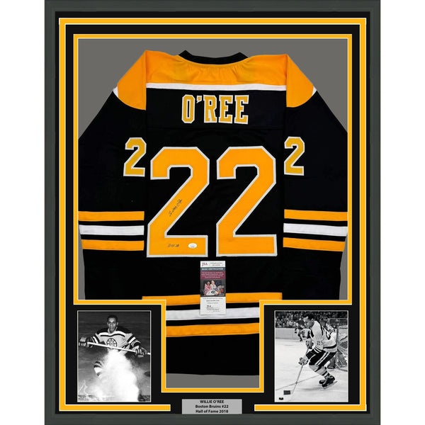 Framed Autographed/Signed Willie O'Ree "HOF 2018" 35x39 Black Jersey JSA COA The item is professionally framed and matted with two 5x7 photos, measures 35x39 inches and is ready to be hung in your man cave! Photo and matting requests can be made.