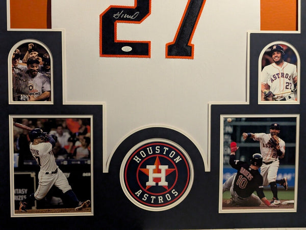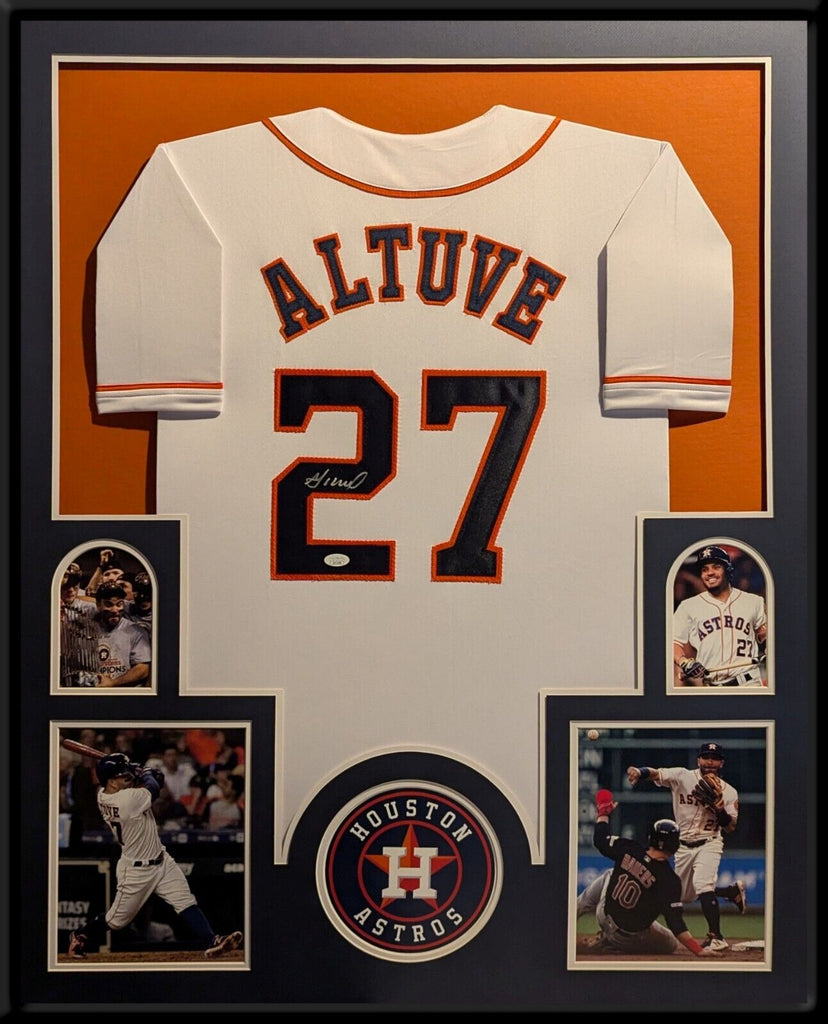Custom Framed in Jose Altuve hand signed Houston Astros jersey.JSA COAThe authentication is from JSA. This signature is authenticated by a representative of JSA! 100% AUTHENTIC!!! The jersey has fully stitched numbers on the front and back. It is a great item and a must for all great sports fans!This item is professionally framed, it measures 32"x40" inside , 42"x34" outside , using UV protective Acrylic glass for safe keeping and safe transport, team color matting, black moulding and hanging hooks on the back. All additional items in frame seen in pictures included. 100% ready to hang in your fan cave.