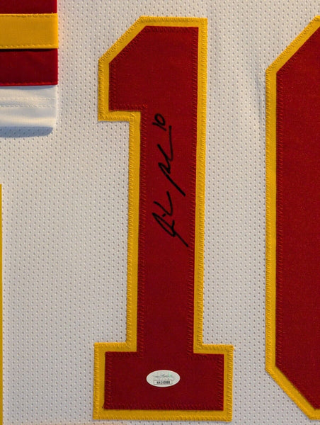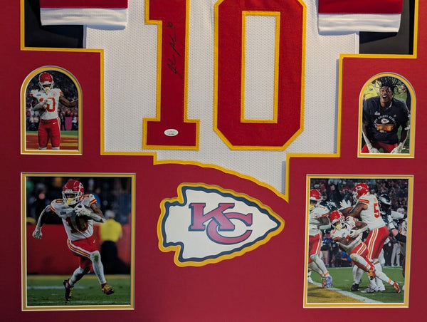 Custom Framed ISIAH PACHECO hand signed Kansas City Chiefs style custom jersey. JSA Hologram and COA The authentication is from JSA. This signature is WITNESSED by a representative of JSA! 100% AUTHENTIC!!! The jersey has fully stitched numbers on the front and back. It is a great item and a must for all great sports fans! This item is professionally framed, it measures 32"x40" inside , 42"x34" outside , using UV protective Acrylic glass for safe keeping and safe transport, team color matting, black moulding and hanging hooks on the back. All additional items in frame seen in pictures included. 100% ready to hang in your fan cave.