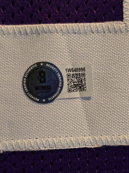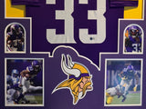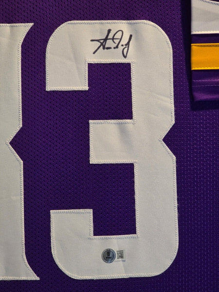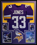 Custom Framed Aaron Jones hand signed Minnesota Vikings style custom jersey.Beckett HologramThe authentication is from Beckett. This signature is authenticated by a representative of Beckett! 100% AUTHENTIC!!! The jersey has fully stitched numbers on the front and back. It is a great item and a must for all great sports fans!Stock photos are used for auctions. Will receive equal quality.This item is professionally framed, it measures 32"x40" inside , 42"x34" outside , using UV protective Acrylic glass for safe keeping and safe transport, team color matting, black moulding and hanging hooks on the back. All additional items in frame seen in pictures included. 100% ready to hang in your fan cave.