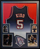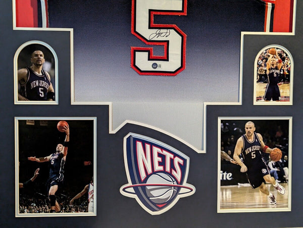 Custom Framed Jason Kidd hand signed New Jersey Nets style custom jersey JSA Hologram and COA The authentication is from JSA. This signature is WITNESSED by a representative of JSA! 100% AUTHENTIC!!! The jersey has fully stitched numbers on the front and back. It is a great item and a must for all great sports fans! This item is professionally framed, it measures 32"x40" inside , 42"x34" outside , using UV protective Acrylic glass for safe keeping and safe transport, team color matting, black moulding and hanging hooks on the back. All additional items in frame seen in pictures included. 100% ready to hang in your fan cave.