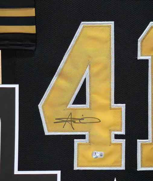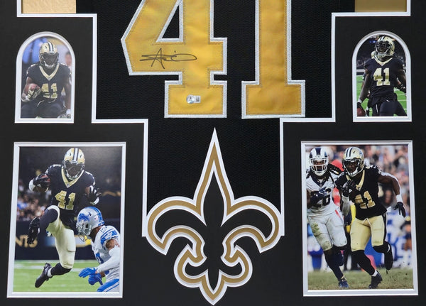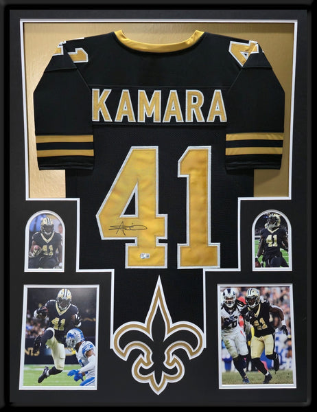 Custom Framed Alvin Kamara hand signed New Orleans Saints style custom jersey.Beckett HologramThe authentication is from Beckett. This signature is WITNESSED by a representative of Beckett! 100% AUTHENTIC!!! The jersey has fully stitched numbers on the front and back. This item is professionally framed, it measures 32"x40" inside , 42"x34" outside , using UV protective Acrylic glass for safe keeping and safe transport, team color matting, black moulding and hanging hooks on the back. All additional items in frame seen in pictures included. 100% ready to hang in your fan cave.