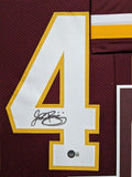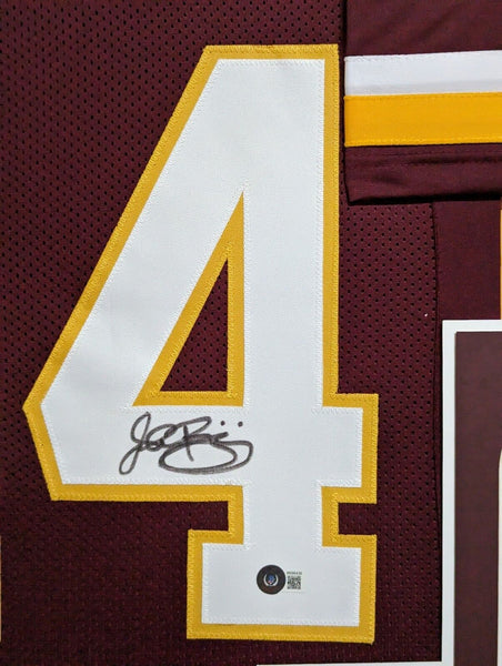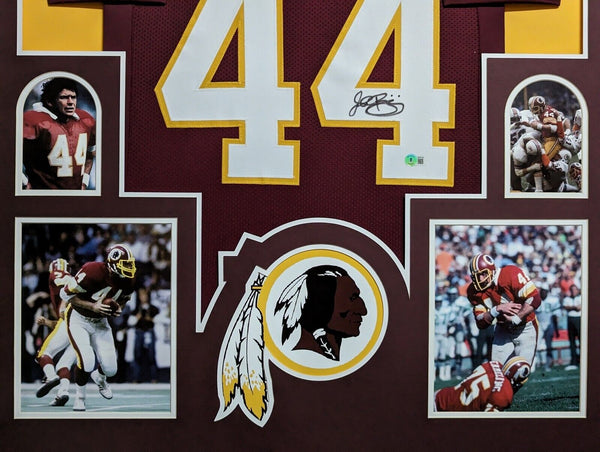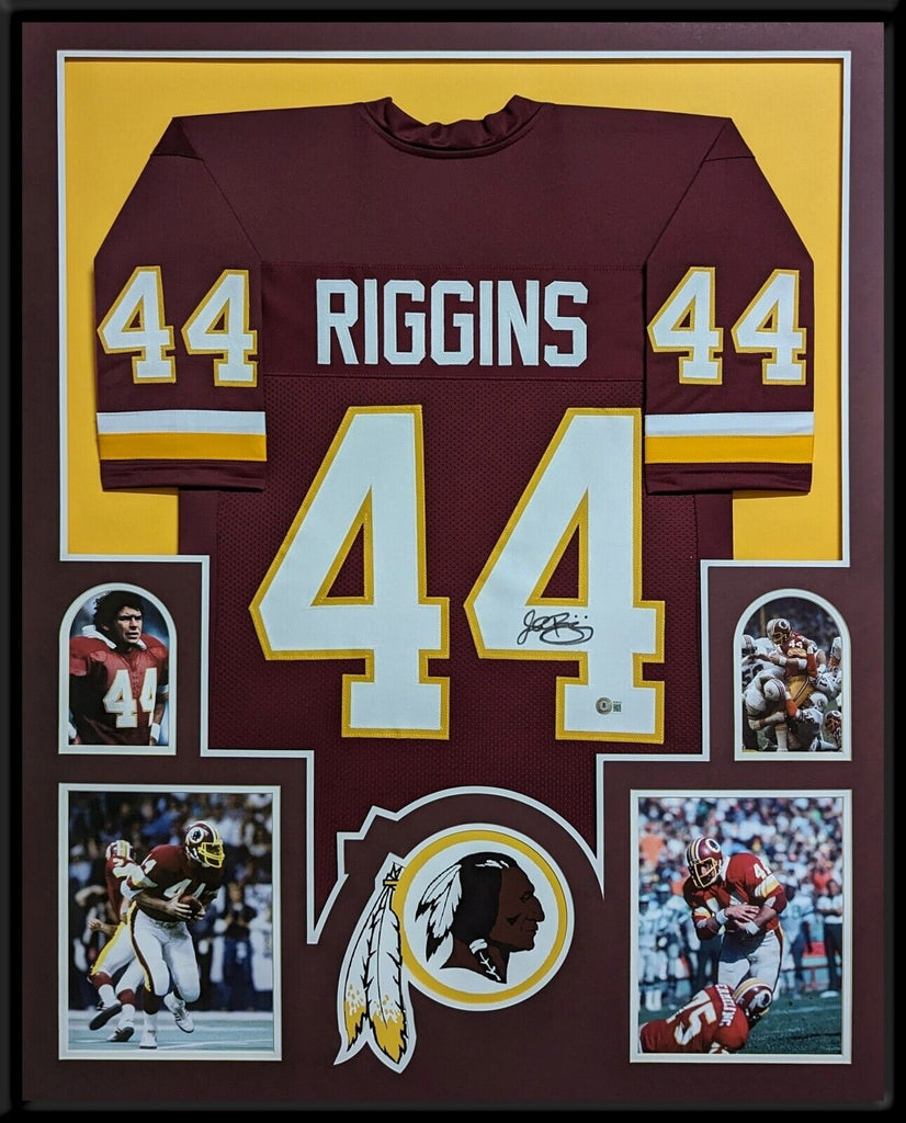 Custom Framed John Riggins hand signed Washington football style custom jersey.Beckett COAThe authentication is from Beckett. This signature is WITNESSED by a representative of Beckett! 100% AUTHENTIC!!! The jersey has fully stitched numbers on the front and back. This item is professionally framed, it measures 32"x40" inside , 42"x34" outside , using UV protective Acrylic glass for safe keeping and safe transport, team color matting, black moulding and hanging hooks on the back. All additional items in frame seen in pictures included. 100% ready to hang in your fan cave.