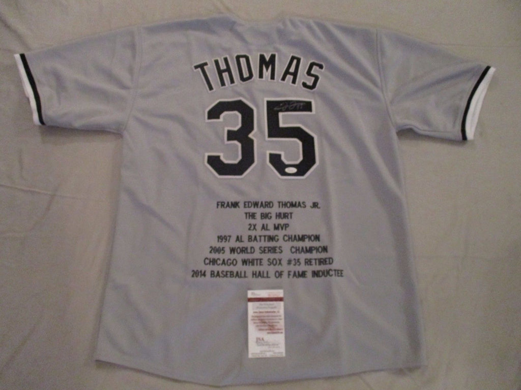 Custom on-field style jersey. Everything is sewn on, size XL. Hand-signed by Frank Thomas (HOF). Thomas's career highlights have been custom stitched onto the back of the jersey below the reverse numbers.The lot / autograph(s) includes an official James Spence Authentication (JSA) hologram and matching COA for authenticity purposes. The signing of this item was witnessed by JSA.Authentication: JSA COA