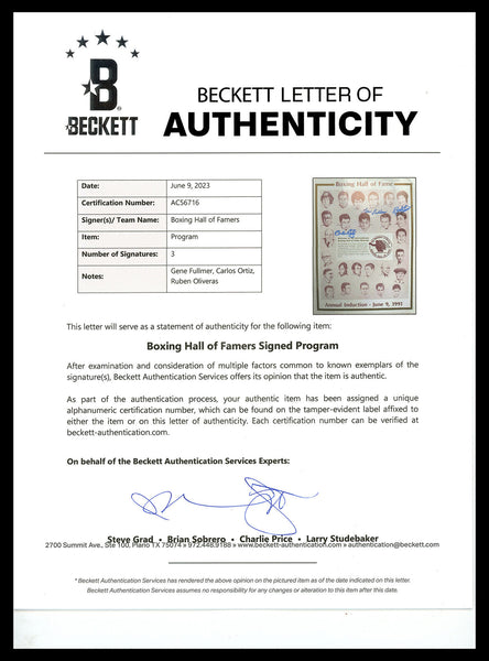 This is a Boxing Hall of Fame 1991 Induction Program that has been hand signed by Gene Fullmer, Ruben Olivares & Carlos Ortiz. This item has been certified authentic by Beckett Authentication (BAS) and comes with their Tamper-Proof Hologram and matching full-page certificate of authenticity.