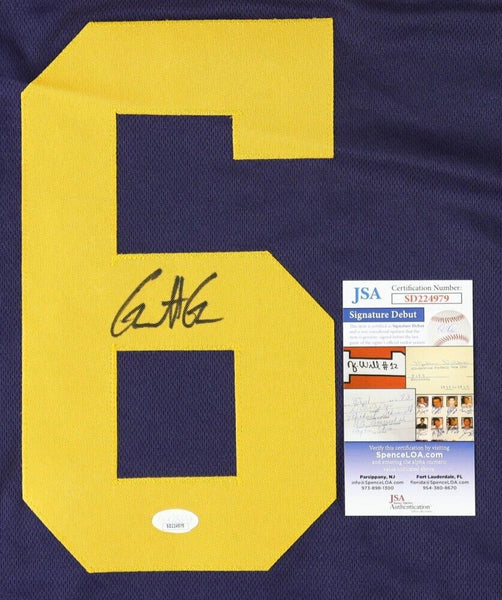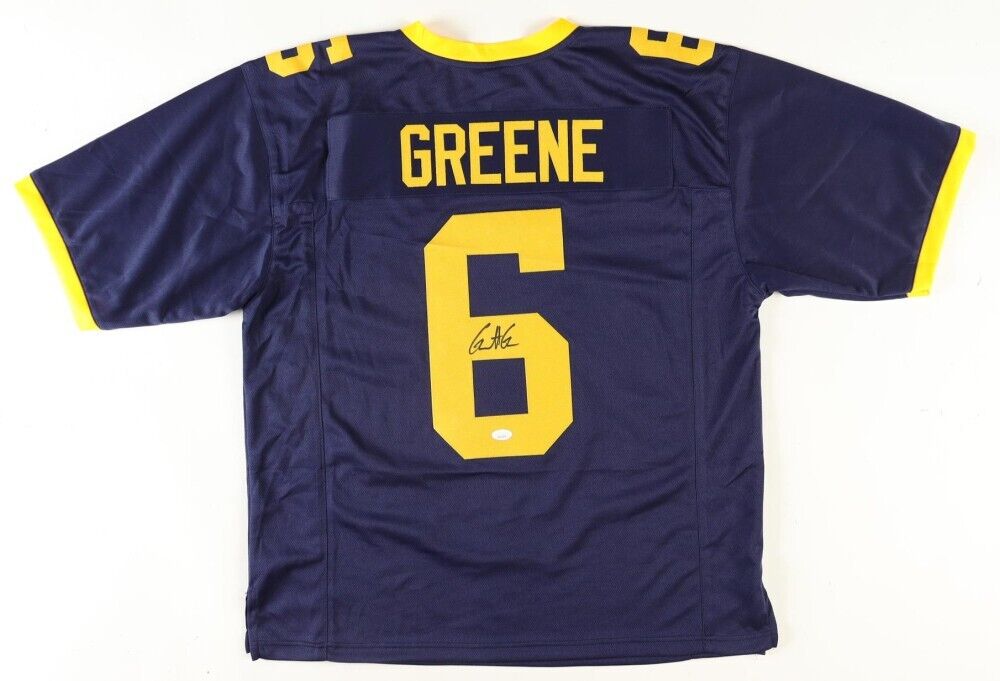 Custom on-field style jersey. Everything sewn on, size XL. Hand-signed by Garrett Greene (West Virginia Mountaineers).The autograph(s) includes an official James Spence Authentication (JSA) "Signature Debut" hologram and COA. "Signature Debut" is the autographed memorabilia equivalent to a rookie card. The JSA definition of a "Signature Debut" is as follows: "Any item that is autographed and received by JSA prior to the last game of the signer's official rookie season.Authentication: JSA COA