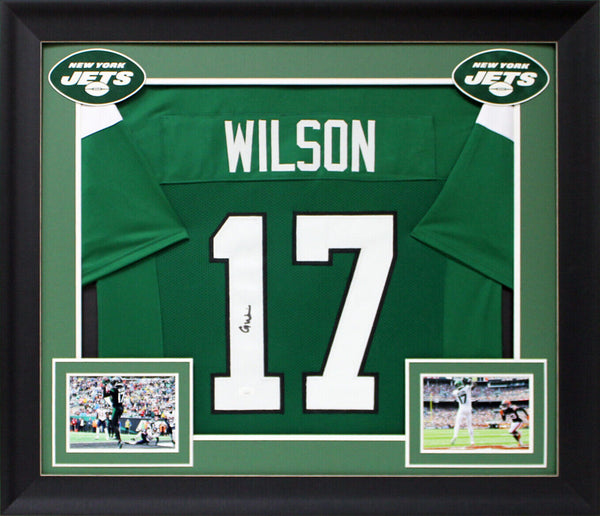 This Autographed Signed on #1 Green Pro Style Framed Jersey has been Personally Signed by Garrett Wilson of the New York Jets. This item is 100% Authentic to include a Certificate of Authenticity (COA) / hologram by JSA Witness. This is a JSA Witnessed Protection Program item which means a JSA representative was present when this item was being signed. We have multiples of this same item. While the photographs are representative of this item, the size, placement and strength of the signature may vary. Each item is hand signed, therefore, each autograph is unique. This item has been professionally framed to overall dimensions of approximately 32 x 37 inches. This is a X-Large sized, non-branded, custom-stitched Framed Jersey. This jersey will be framed to order, it will take 3-4 days from purchase date for it to ship.