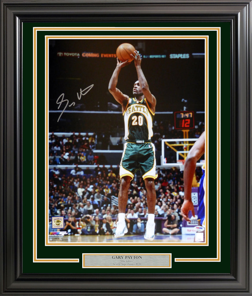 This is a Framed 16x20 Photo, approximately 24x28 with the frame, that has been hand signed by Gary Payton. This item has been certified authentic by PSA/DNA and comes with their tamper-proof sticker and matching certificate of authenticity.