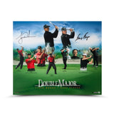 The career Grand Slam in golf occurs when an athlete wins all four majors – Masters Tournament, U.S. Open, British Open and PGA Championship -- at one point in their professional career. The rare feat has only been accomplished by five golfers. Two of the five have placed their autograph on this unique designed image. Gary Player and Tigers Woods are joined by Gene Sarazen, Ben Hogan and Jack Nicklaus as the five golfers who have achieved that rare level of greatness. Together Player and Woods own 23 major championships, including seven Masters titles and six British Open championships. This designed piece showcases 10 action images while highlighting key major championships that gave each of them the career Grand Slam. Player and Woods have signed this Double Major 20" x 24" image in black paint pen. His signature is deemed authentic by virtue of Upper Deck Authenticated's Five Step Process.
