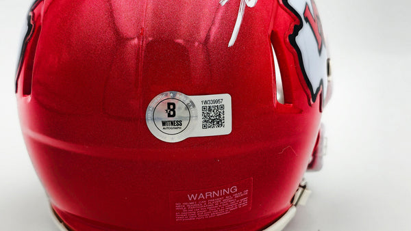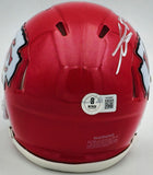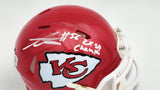 This is a Kansas City Chiefs Red Speed Mini Helmet that has been hand signed by George Karlaftis. This item was inscribed "2x SB Champs." This item has been witnessed and certified authentic by Beckett Authentication (BAS) and comes with their tamper-proof witness sticker.