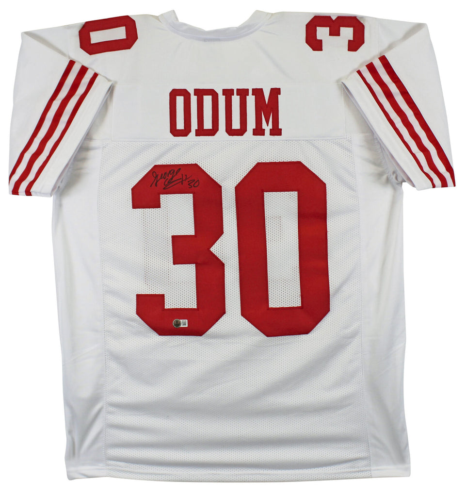This Autographed White Pro Style Jersey has been Personally Signed by George Odum of the San Francisco 49ers. This item is 100% Authentic to include a hologram by Beckett Authentication Services. This item will come with an affixed Beckett Authentication Services (BAS) authentication sticker, which includes a scannable QR code to verify authenticity. Please note that Beckett no longer provides serial-numbered COA cards, and the attached BAS sticker will serve as the complete authentication for this item. This is a BAS Witnessed Protection Program item which means a Beckett Authentication Service representative was present when this item was being signed. We conducted an autograph signing with George Odum where multiples of the same item were signed. While the photographs are representative of this item, the size, placement and strength of the signature may vary. Each item is hand signed, therefore, each autograph is unique. This item can be verified through BAS Witnessed. This is a X-Large sized, non-branded, custom-stitched Jersey.