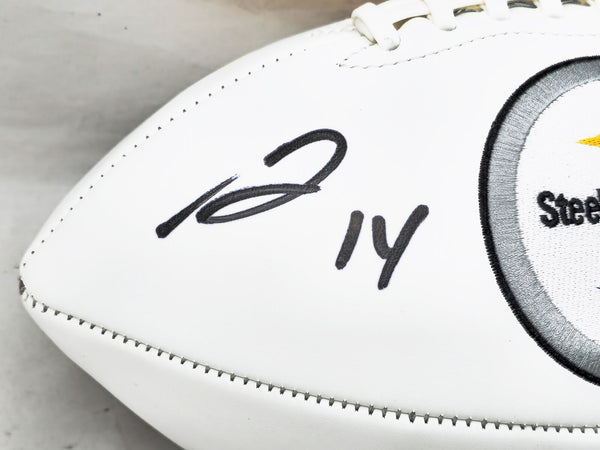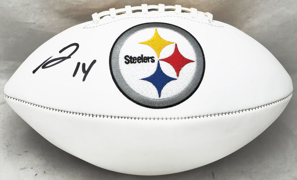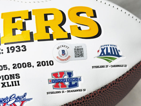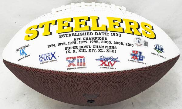 This is an Official Pittsburgh Steelers White Logo Football that has been hand signed by George Pickens. Please note, there is a small crease in the bottom white panel as shown. There is an imperfection in the signature as shown. This item has been certified authentic by Beckett Authentication (BAS) and comes with their tamper-proof QR Code hologram that can be verified on the Beckett-authentication.com.