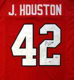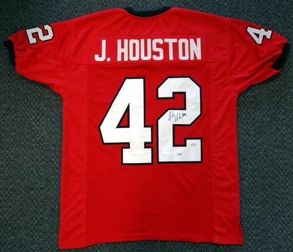 This is a Red Custom Jersey that has been hand signed by Justin Houston. This is a custom jersey with no name brand. The approximate size is XL. It has nice sewn in name and numbers. This item has been certified authentic by PSA/DNA and comes with their tamper-proof sticker and matching certificate of authenticity.