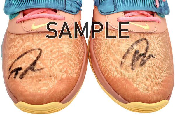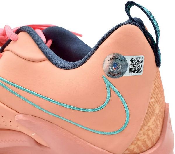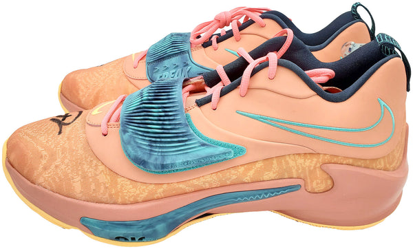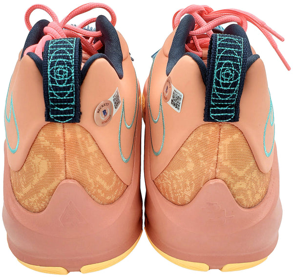 This is a pair of Crimson Bliss Nike Zoom Freak Shoes that has been hand signed by Giannis Antetokounmpo. A This pair of shoes also comes with the original shoe box. This item has been certified authentic by Beckett Authentication (BAS) and comes with their tamper-proof QR Code sticker that can be verified on the Beckett-authentication.com. NOTE: This is a stock item and we have multiple quantities of this item. Giannis' signature on these shoes may vary from the original picture on this listing. We have provided a couple sample photos from other pairs of shoes of this style. After purchasing this item, please contact us and we can send you pictures of the signatures that we still have stock of.