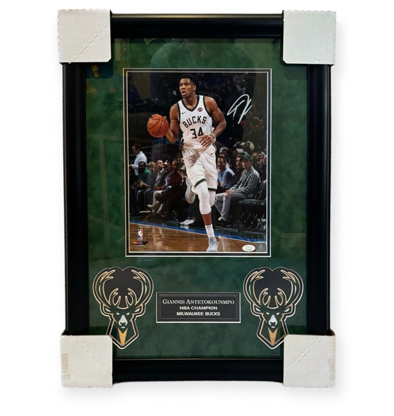 This 11x14 photograph framed to 14x21 has been personally hand-signed by Giannis Antetokounmpo of the Milwaukee Bucks100% Authentic Certificate of authenticity by JSAasgmemorabilia.com