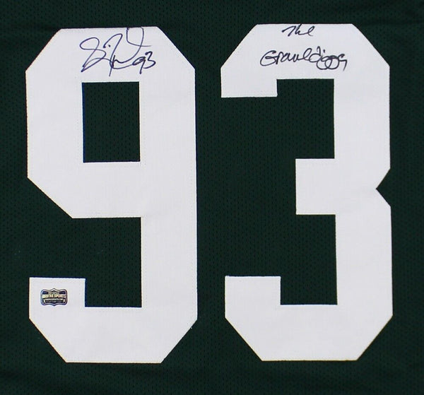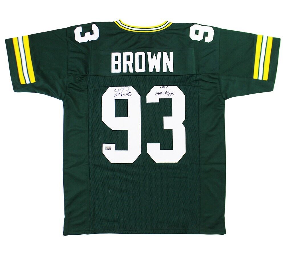 A Green Bay Custom Green Jersey hand signed by Gilbert Brown. The item and signature are in excellent condition. In addition to signing his name, Gilbert also inscribed "The Gravedigger" on the item. Gilbert is a former football nose tackle. He spent his career with the Green Bay Packers & is a XXXI Super Bowl Champ. AUTHENTICATION: Your item has been tagged with a SmarTag powered by Prova Technology, which gives you digital access to your items authentication records.