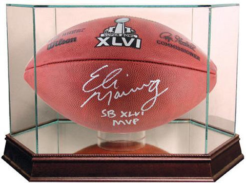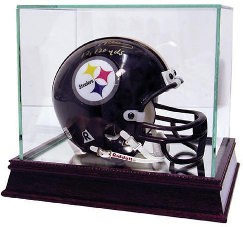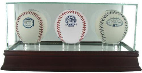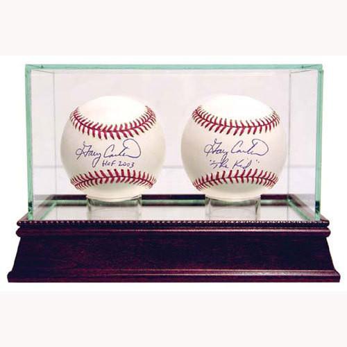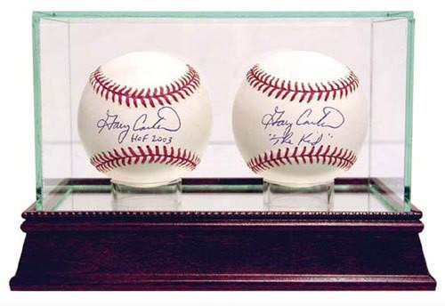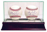 Our glass display cases are a necessity for any committed sports memorabilia enthusiast. Your timeless pieces whether autographed helmets or balls will be safe from dust and fading with our top-of-the-line exquisitely crafted cases. Each UV-protected display case is hand-made and includes a removable glass top for easy access. With a mirrored bottom and stunning cherry wood base your memorabilia will look stylish and protected in any setting. The dimensions of this double baseball display case are 7x4x4. The available space within the case is 7 inches in length with a width and a height of 3.75 inches. We now provide special laser engraving for the glass case with your own company logo.