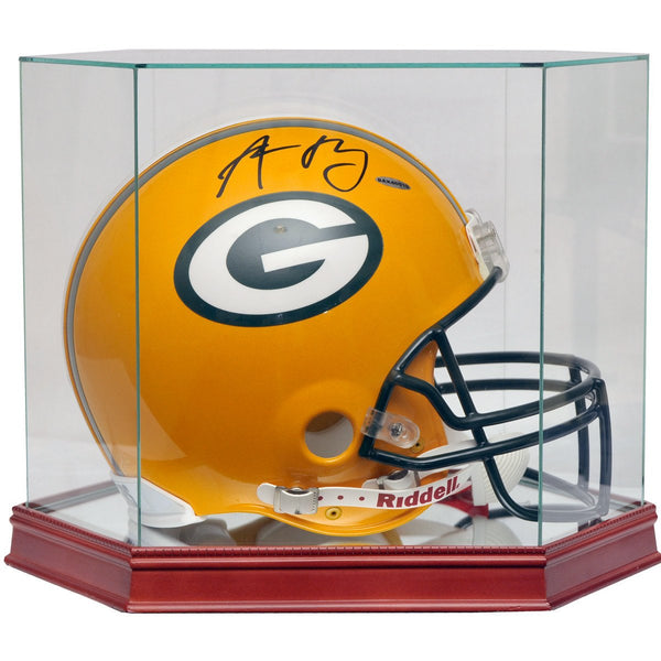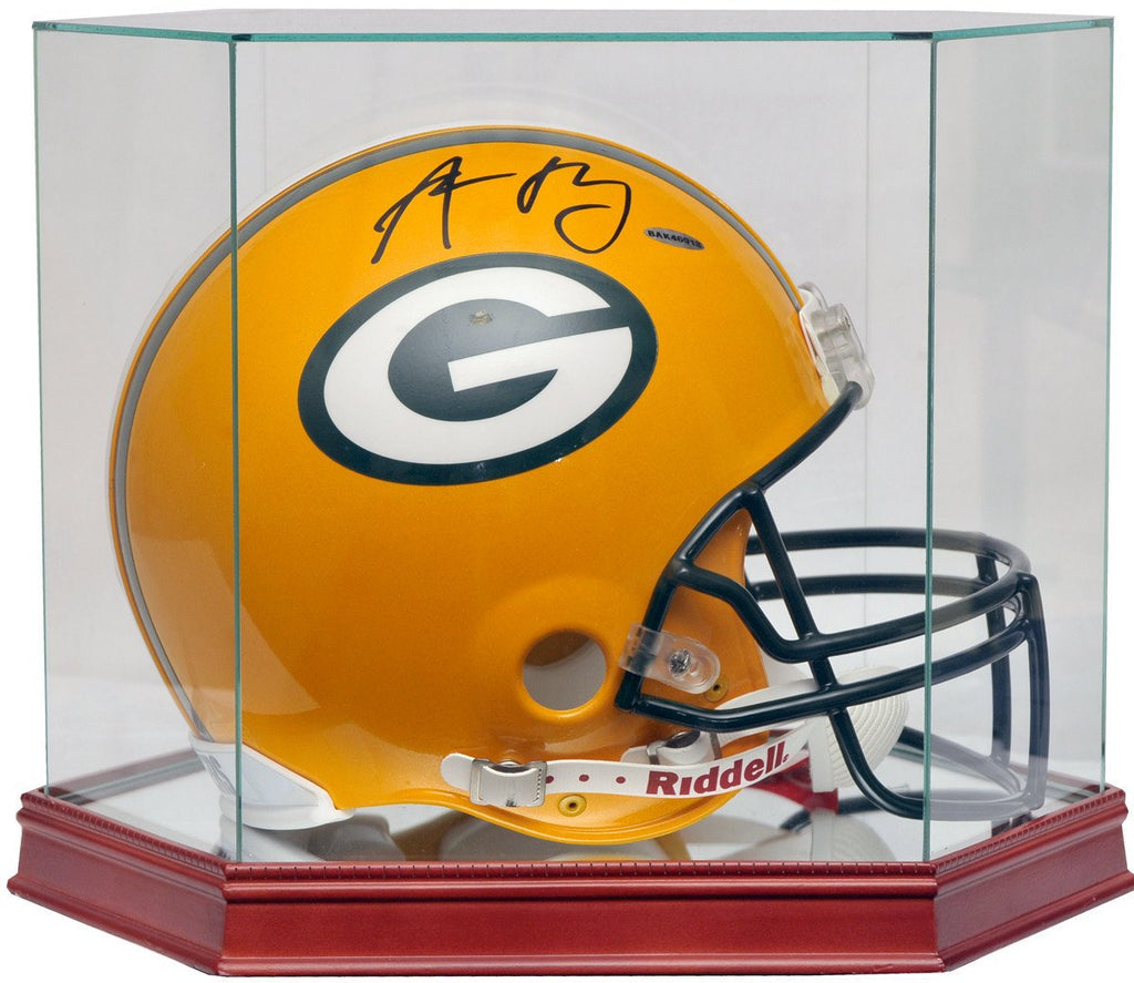 Our glass display cases are a necessity for any committed sports memorabilia enthusiast. Your timeless pieces whether autographed helmets or balls will be safe from dust and fading with our top-of-the-line exquisitely crafted cases. Each UV-protected display case is hand-made and includes a removable glass top for easy access. With a mirrored bottom and stunning cherry wood base your memorabilia will look stylish and protected in any setting.This helmet display case measures at 15x10.5x11. The available space within the case is 15 inches in length with a width of 10.5 inches and a height of 11 inches.