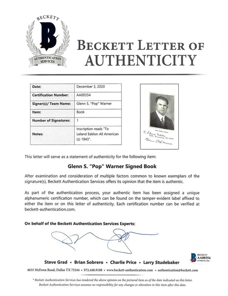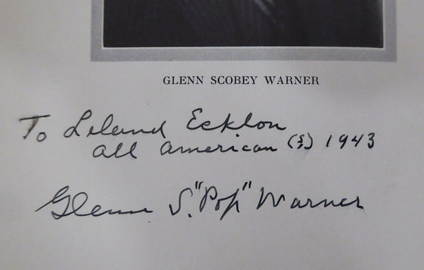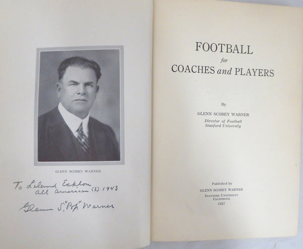 This is a 1927 1st Edition Football for Coaches & Players book that has been hand signed by Glenn S "Pop" Warner. The book has been certified authentic by Beckett (BAS) and comes with their sticker and matching full page certificate of authenticity.?a The book is inscribed "To Leland Eeklon, All American 1943".