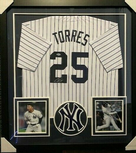 Custom frame measures approximately 36" x 39" in size and features a jersey which has been hand-signed in silver paint pen by Gleybar Torres. The lot / autograph(s) includes an official Beckett Authentication Services (BAS) hologram and matching COA for authenticity purposes. Authentication: Beckett COA