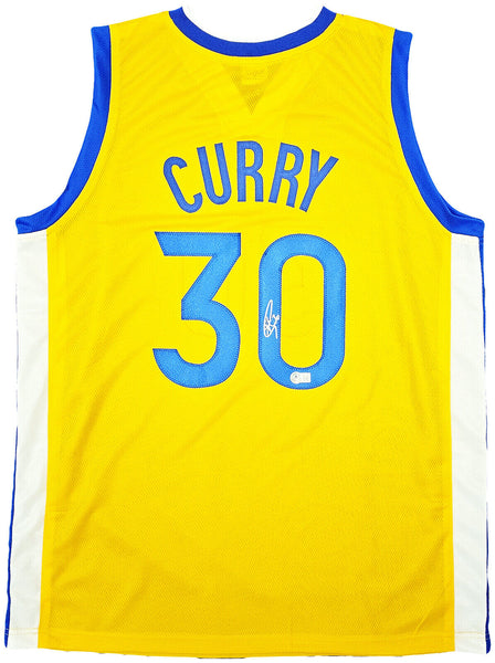 This is a Yellow Jersey that has been hand signed by Stephen Curry. This is a custom jersey with no name brand. The approximate size is XL. It has nice sewn in name and numbers. This item has been certified authentic by Beckett Authentication (BAS) and comes with their tamper-proof sticker. Beckett Authentication has recently changed their physical certificate card policy where they no longer match their tamper-proof sticker with a physical certificate. If the item features a Beckett Authenticated QR Code, the item does NOT come with a matching certificate. A certificate can be printed on Beckett's website for the matching authentication number.