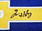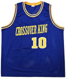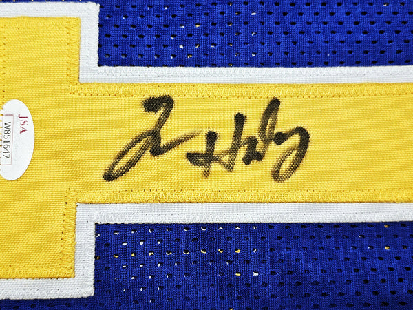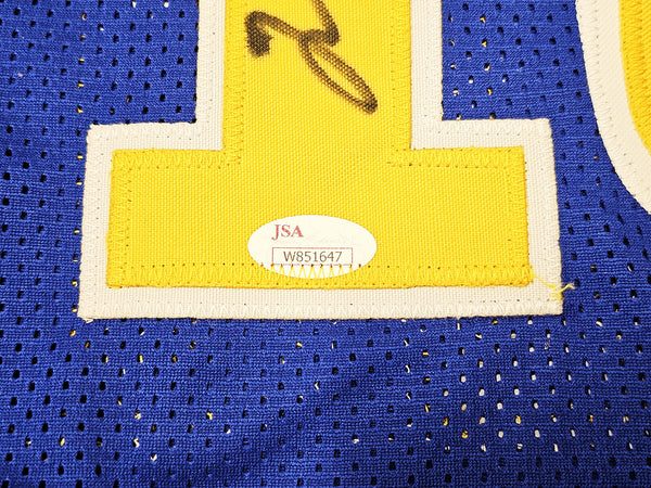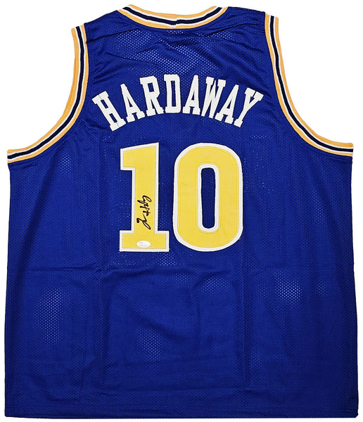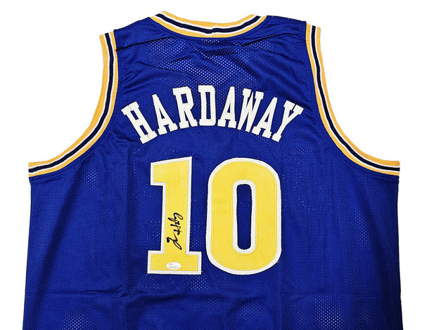 This is a Blue Jersey that has been hand signed by Tim Hardaway. This is a custom jersey with no name brand. The approximate size is XL. It has nice sewn in name and numbers. This item has been certified authentic by JSA and comes with their tamper-proof sticker and matching certificate of authenticity.