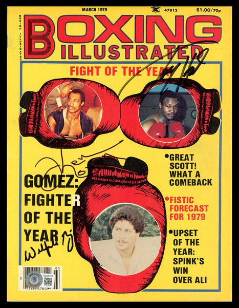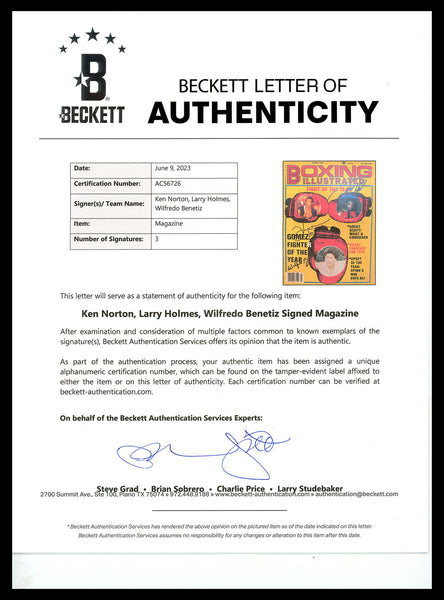 This is a Boxing Illustrated magazine that has been hand signed by Wilfredo Gomez, Ken Norton & Larry Holmes. This item has been certified authentic by Beckett Authentication (BAS) and comes with their Tamper-Proof Hologram and matching full-page certificate of authenticity.