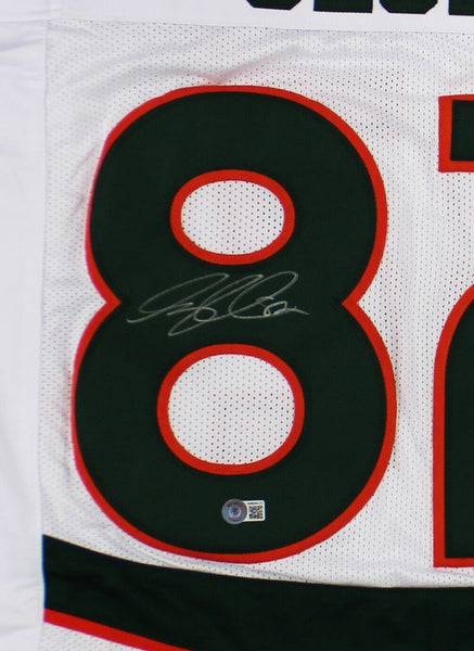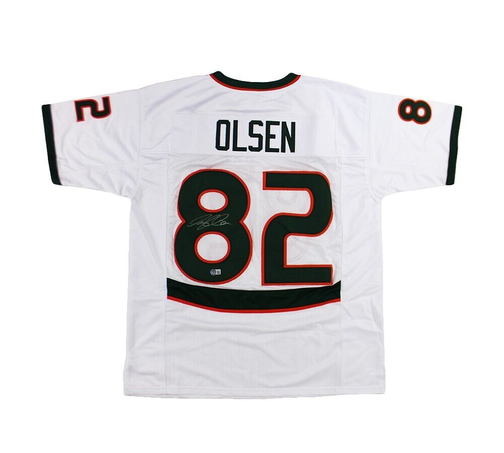 A University of Miami Hurricanes Custom White Jersey hand signed by Greg Olsen. The item and signature are in excellent condition. Greg is a 3x Pro Bowler, 2x Second- Team All-Pro, and holds an NFL record as the first tight end in league history to record three consecutive seasons with 1,000 receiving yards. AUTHENTICATION: The Item is accompanied by a Beckett Serial Numbered and Databased Hologram