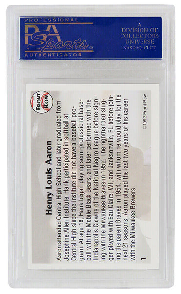 Hank Aaron signed Atlanta Braves Front Row trading card #1. The card has been authenticated and slabbed by PSA/DNA and the number can be verified online. The image of the item is a stock photo, as we may have multiples of the item in stock. The Slabbed Card you will receive will be of the card described. (Same grade, Same authentication) You may or may not receive the exact PSA serial number on the slab label shown in image.