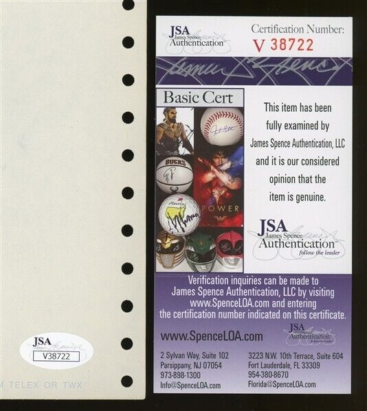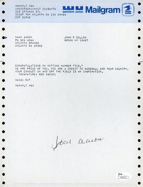 This autographed USPS Western Union Mailgram has been personally hand-signed by 'Hammerin' Hank Aaron. The mailgram measures roughly 8.5x11 inches. This autograph is certified by James Spence Authentication (JSA). It comes with the numbered hologram and matching Certificate of Authenticity. Henry Aaron finished the 1973 season with 713 career home runs, then waited all winter for his appointment with destiny.In Aaron-like, workmanlike fashion, the Braves slugger quickly ended the drama just four games into the 1974 campaign.On April 8, 1974, Aaron's fourth-inning home run off the Dodgers' Al Downing gave him 715 for his career and sent him past Babe Ruth on baseball's all-time list. The homer came on the heels of an Opening Day blast against the Reds' Jack Billingham that left Aaron tied with Ruth.After sitting out the Braves' second game of the three-game set with the Reds on April 6, Aaron returned to the lineup April 7 and went 0-for-3, setting the stage for the Braves' first home game of the year the following night against the Dodgers.Aaron drew a walk leading off the bottom of the second inning, leaving the sellout crowd of 53,775 at Atlanta-Fulton County Stadium restless. Aaron quickly scored on a double by Dusty Baker, giving the Braves a 1-0 lead.The Dodgers, who would go on to win the National League pennant in 1974, took a 3-1 lead in the top of the third inning. A single by Downing scored the soon-to-be 1974 NL Most Valuable Player, Steve Garvey, who was batting seventh that night, with the Dodgers' first run. Downing and Davey Lopes later scored on a double by Jim Wynn to make it 3-1.But in the bottom of the fourth, Darrell Evans reached on an error by Dodgers shortstop Bill Russell to lead off the frame. Aaron followed by hitting a 1-0 pitch from Downing over the left-centerfield wall to tie the game - and surpass Ruth."He's sitting on 714," said Braves broadcaster Milo Hamilton right before one of the most famous swings in baseball history. "Here's the pitch by Downing. Swinging. Here's a drive into left center field. That ball is gonna be ... outta here! It's gone! It's 715! There's a new home run champion of all time, and it's Henry Aaron."The Braves would add two more runs in the fourth to take a 5-3 lead that would turn into a 7-4 victory. Following Aaron's home run, Downing walked Dusty Baker and Davey Johnson, prompting Dodgers manager Walter Alston to call on relief pitcher Mike Marshall - one of his record 106 appearances that season. Downing was charged with the Dodgers' loss, while Ron Reed picked up the win for the Braves with the help of a save from Buzz Capra.With the Braves leading 7-4 entering the eighth inning, Atlanta manager and future Hall of Famer Eddie Mathews removed Aaron from the game in favor of Rowland Office.Aaron would hit 40 more home runs over the course of the rest of the 1974 season and the 1975-76 campaigns with the Milwaukee Brewers, leaving him with 755 for his career. Aaron's 2,297 RBI and 6,856 total bases remain big league records.