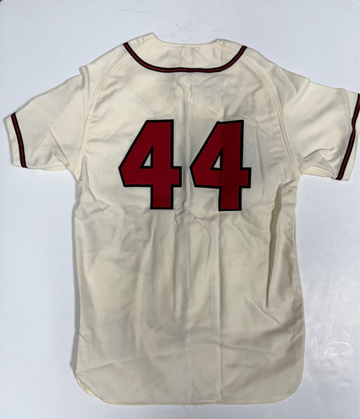 autographed Official 1957 Mitchell & Ness Jersey of Milwaukee Braves and Brewers Hall of Famer HANK AARON. This jersey is signed with Black sharpie. This jersey is size Medium (40) with all letters and numbers sewn in. This item was signed at a private signing with us and would make a great addition to any Hank Aaron collection. This autograph is guaranteed to be 100% authentic and will include a COA from JSA authentication.