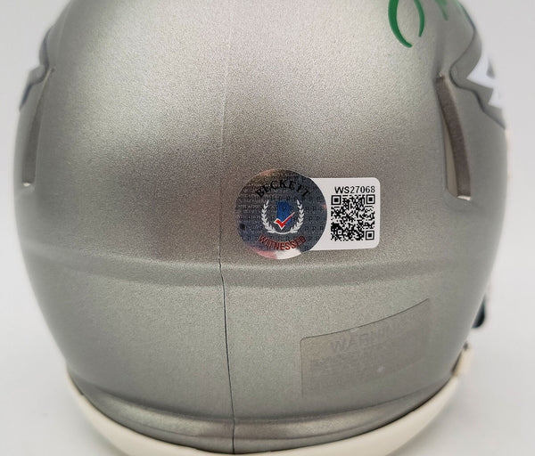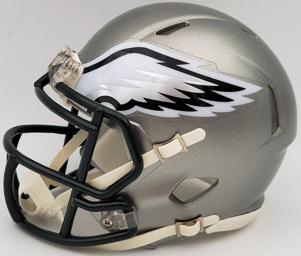 This is a Philadelphia Eagles Flash Silver Speed Mini Helmet that has been hand signed by Herschel Walker. The Flash helmets are very delicate and often have some marks or scratches on them. This item has been certified authentic by Beckett Authentication (BAS) and comes with their tamper-proof QR Code sticker that can be verified on the Beckett-authentication.com.