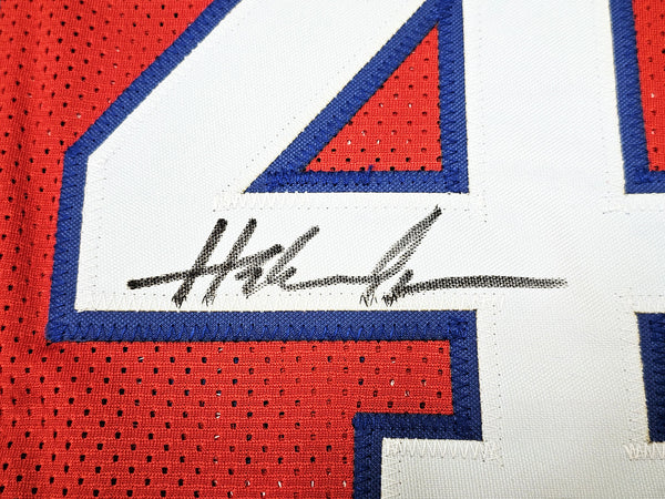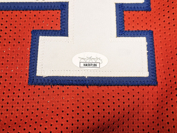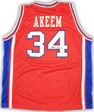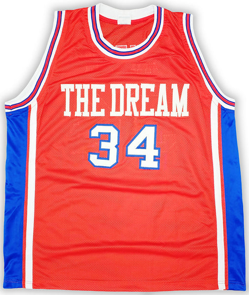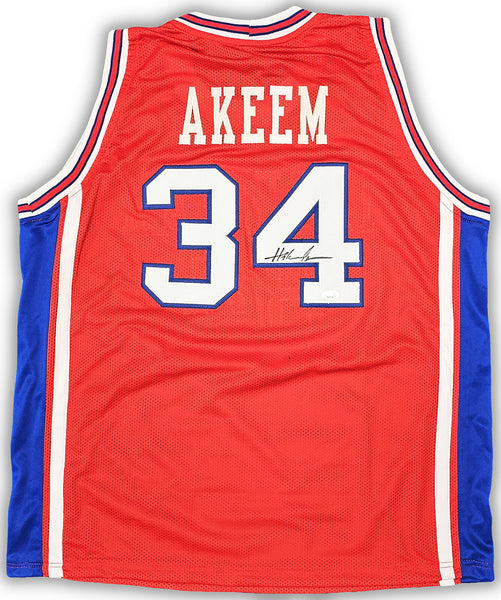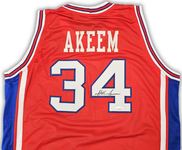 This is a Red Jersey that has been hand signed by Hakeem Olajuwon. This is a custom jersey with no name brand. The approximate size is XL. It has nice sewn in name and numbers. This item has been certified authentic by JSA and comes with their tamper-proof sticker and matching certificate of authenticity.