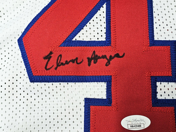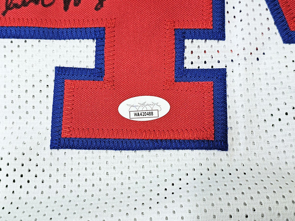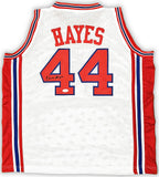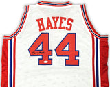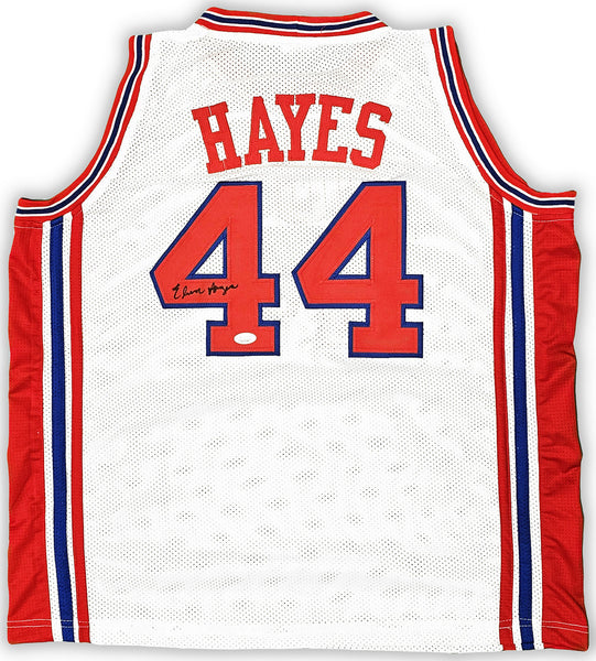 This is a White Jersey that has been hand signed by Elvin Hayes. This is a custom jersey with no name brand. The approximate size is XL. It has nice sewn in name and numbers. This item has been certified authentic by JSA and comes with their tamper-proof sticker and matching certificate of authenticity.