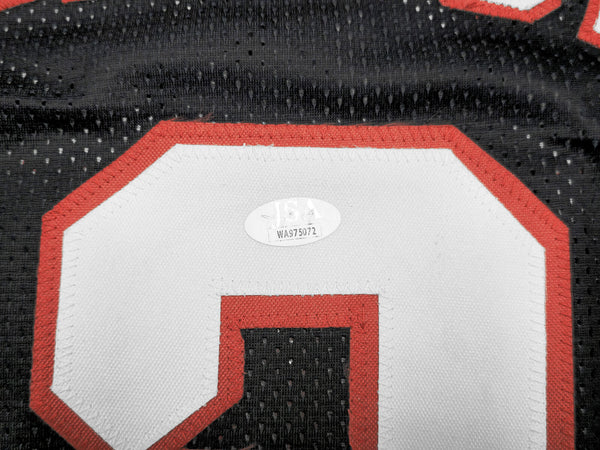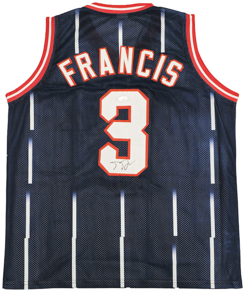 This is a Blue Jersey that has been hand signed by Steve Francis. This is a custom jersey with no name brand. The approximate size is XL. It has nice sewn in name and numbers. This item has been certified authentic by JSA and comes with their tamper-proof sticker and matching certificate of authenticity.