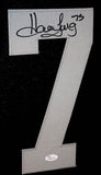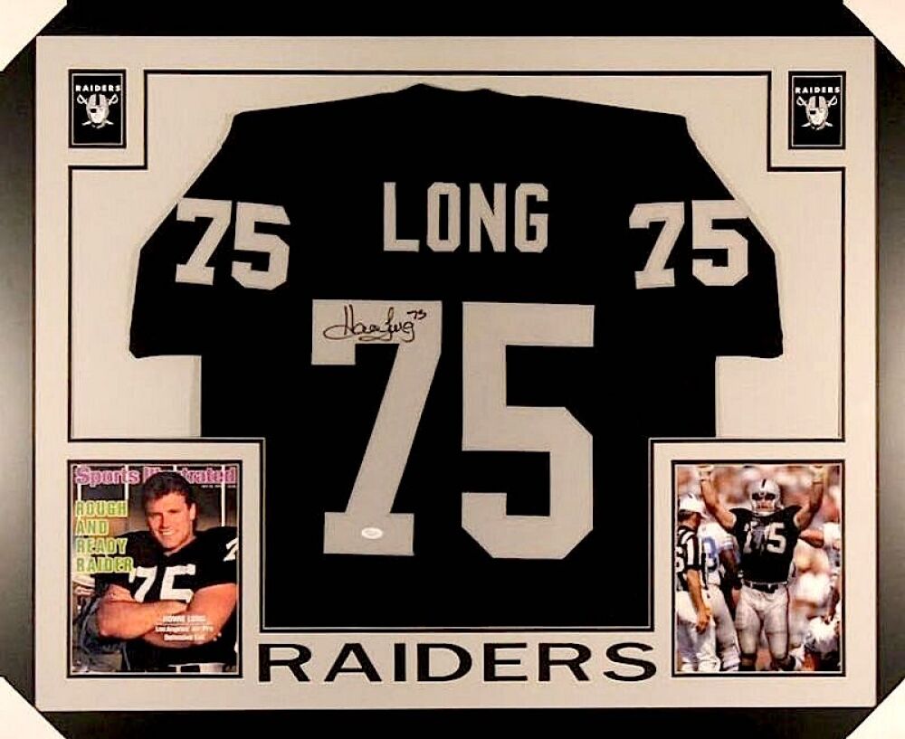 Custom framed display measures 35" x 43" in size. Features a jersey which has been hand-signed in black felt-tip pen by Howie Long (HOF). The autograph includes an official James Spence Authentication (JSA) hologram and matching COA for authenticity purposes. The signing of this item was witnessed by JSA.Authentication: JSA COA