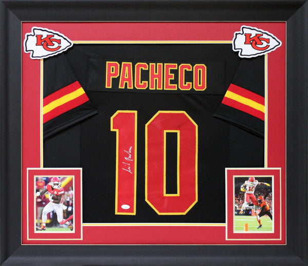 This Autographed Black Pro Style Framed Jersey has been Personally Signed by Isiah Pacheco of the Kansas City Chiefs. This item is 100% Authentic to include a Certificate of Authenticity (COA) / hologram by JSA. We have multiples of this same item. While the photographs are representative of this item, the size, placement and strength of the signature may vary. Each item is hand signed, therefore, each autograph is unique. This item has been professionally framed to overall dimensions of approximately 32 x 37 inches. This is a X-Large sized, non-branded, custom-stitched Framed Jersey. This jersey will be framed to order, it will take 3-4 days from purchase date for it to ship.