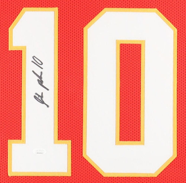 Custom frame measures approximately 35" x 43" in size and features a jersey hand-signed by Isiah Pacheco. Please note that the 8" x 10" photos may be in different order.The autograph includes an official James Spence Authentication (JSA) hologram for authenticity purposes. The signing of this item was witnessed by JSA.Authentication: JSA Hologram