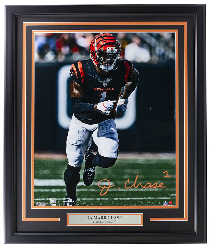Featured is a Ja'marr Chase signed framed 16x20 Cincinnati Bengals football photo. This photo was hand signed by Ja'marr Chase and has been authenticated by Beckett authentication services. Included with the photo is a Beckett hologram and certificate of authenticity. This photo has been professionally framed and matted and measures approximately 22x27. SPECIFICATIONS Autographed By: Ja'marr Chase Team: Cincinnati Bengals Sport: Football Authentication: Beckett Grading Services