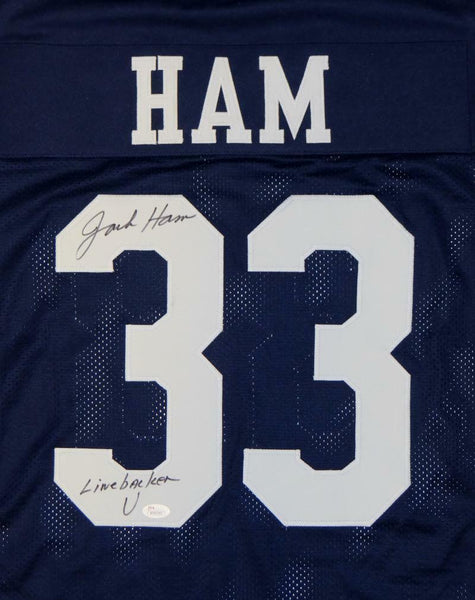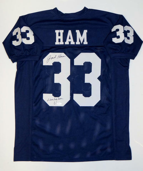 THIS IS NOT AN NCAA JERSEY. This HAS NO TAGS, NO LOGOS, NO EMBLEMS. This is a hand autographed Jersey of Jack Ham. This is Custom Made (Non Name Brand) Authentic Style (Stitched Letters and Numbers). This item has a James Spence Witness Authentication, which comes with a JSA numbered sticker and a matching JSA COA. You can view this item on the SpenceLOA website and it shows when and where the item was signed. It was signed either at a public autograph appearance or a Private Signing. This is a stock photo of the item. Although you may not receive this exact item, the item you receive is virtually identical and brand new in great shape. THIS IS NOT AN NCAA JERSEY. This HAS NO TAGS, NO LOGOS, NO EMBLEMS. This is a hand autographed Jersey of Jack Ham. This is Custom Made (Non Name Brand) Authentic Style (Stitched Letters and Numbers). This item has a James Spence Witness Authentication, which comes with a JSA numbered sticker and a matching JSA COA. You can view this item on the SpenceLOA website and it shows when and where the item was signed. It was signed either at a public autograph appearance or a Private Signing. This is a stock photo of the item. Although you may not receive this exact item, the item you receive is virtually identical and brand new in great shape.